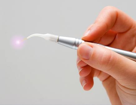 When a patient comes to see us with periodontal disease, we can use a very small laser to eliminate the bacteria below the gum line. The tiny laser tip is placed next to a tooth inside the small space between it and the gums, and it exposes the infected tissue to a highly-concentrated beam of light. This accomplishes a number of things at the same time: